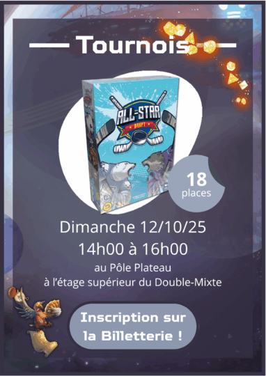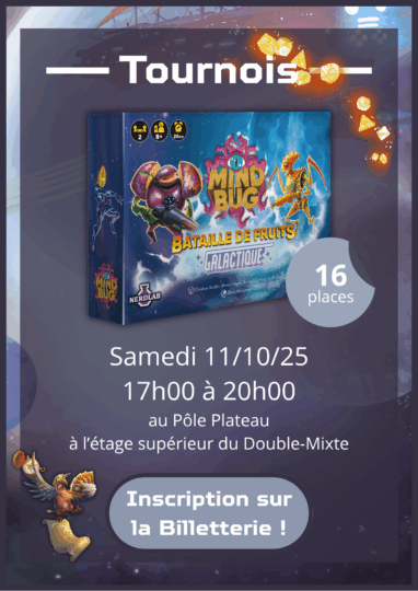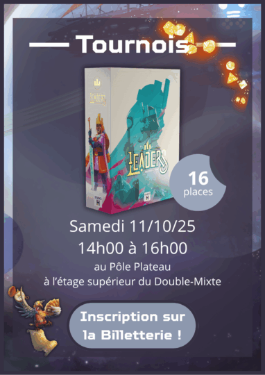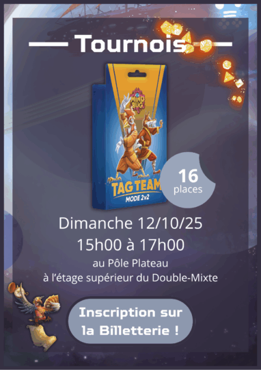 • Des tournois sont proposés sur le week-end de la Convention avec des tournois sur des jeux récents et populaires. N’hésitez pas à vous inscrire sur la Billetterie.